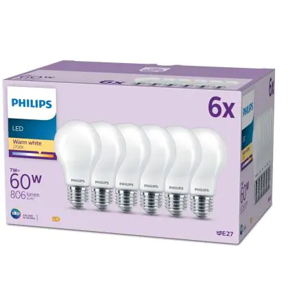 La Confezione Multipack 6x Philips Bulbo LED E27 Pera Ghiaccio 7W 806lm - 827 Bianco Molto Caldo è la perfetta sostituzione per la tua lampada convenzionale W con attacco E27 grazie alla sua tecnologia LED. Passare a LED ti offrirà tanti vantaggi!