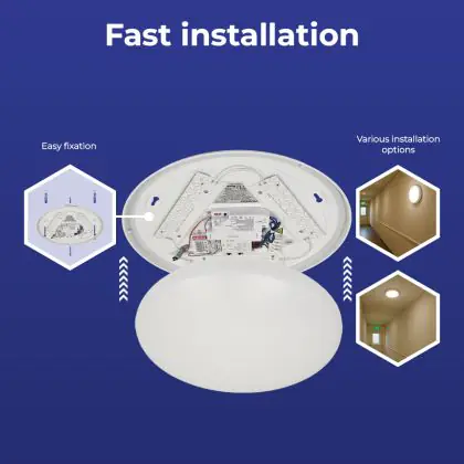Prima di sostituire un vecchio apparecchio di illuminazione con uno nuovo è sempre consigliabile controllare le dimensioni. Installare questa plafoniera LED è molto facile: basta leggere attentamente le istruzioni e utilizzare il materiale di installazione fornito (viti, tasselli, ecc.). Se hai dubbi sull’installazione consulta un installatore certificato. Per questa lampada offriamo una garanzia di 5 anni.