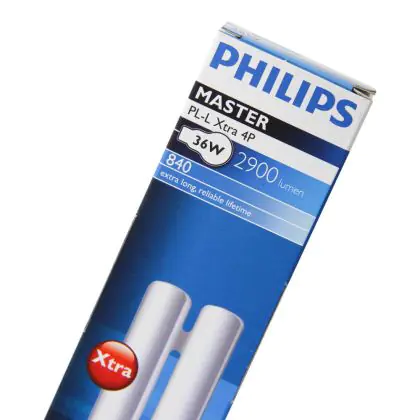 Le Philips PL-L Xtra 36W 840 4P (MASTER) sono lampade fluorescenti compatte a basso contenuto di mercurio. Sono molto efficienti e garantiscono elevate performance di illuminazione per lunghi periodi di funzionamento, con altresí un ridotto numero di guasti prematuri. Tali lampade fluorescenti compatte sono dotate di attacco 2G11 e la base presenta 4 pin (perni). La potenza delle stesse é pari a 36W. Quando sostituisci le tue lampade fluorescenti compatte é fondamentale scegliere le nuove con il medesimo attacco, numero di pin (perni) e potenza di quelle che stai attualmente usando altrimenti non sarai in grado di installarle.Queste lampade fluorescenti compatte profondono una luce bianca fredda grazie alla temperatura di colore di 4000K. L'indice di resa cromatica é davvero buono in quanto si colloca nell'intervallo di 80-89Ra. Inoltre, la durata totale media delle lampade stesse é incredibilmente lunga, 36.000 ore! Praticamente una vita più che doppia rispetto alla linea classica Philips PL-L.