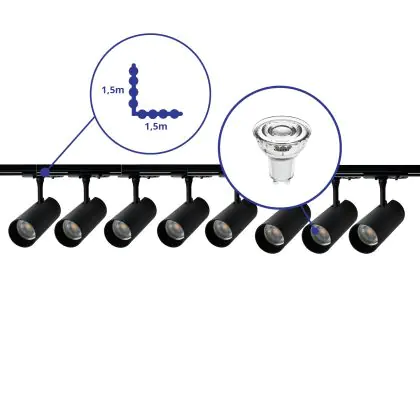 | Nome del fabbricante | Complete L shaped 1-Phase Track Set Black incl. 8x Spot fixture + GU10 2700K 3W Dim – 1,5 x 1,5 mete | |