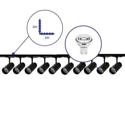 Descrizione Set completo 1-Fase Rail L 2 x 2 Metro Nero | incl. 10x Faretti + GU10 2700K 3W Dimmerabile + Tappo Di Chiusura, Connettore di Alimentazione e L -Connettore